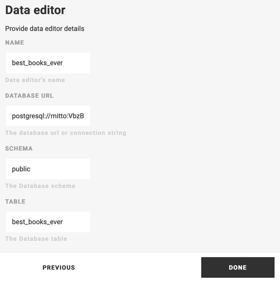 Click Done. You may need to refresh your browser for the data editor to appear on the left sidebar.