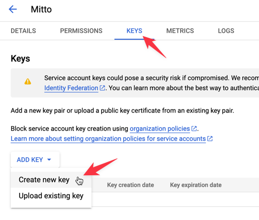 Click the KEYS tab. Select Create new key from the ADD KEY drop-down.