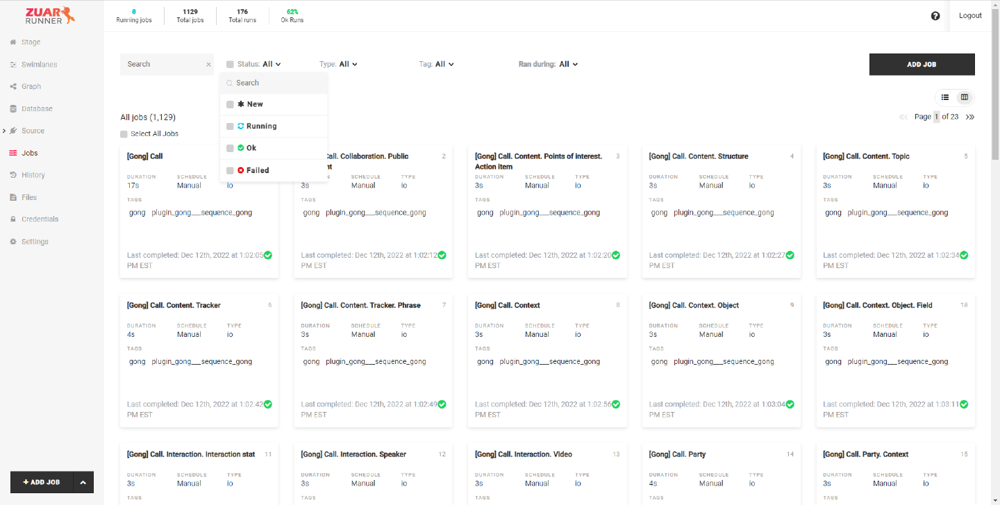 The jobs page is very similar to the Stage but used for searching and displaying all jobs on the Zuar Runner instance. There are a variety of filters that can be used for finding specific jobs as well as a search field: